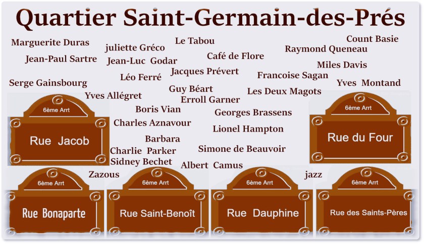 La fine fleur de la chanson française, inconnu à l’époque, s’appelait Georges Brassens, Jacques Brel, Léo Ferré, Juliette Gréco, Boris Vian, les Frères Jacques, Francis Lemarque, Cora Vaucaire, Serge Lama, Charles Aznavour, Mouloudji, Catherine Sauvage, sans oublier Serge Gainsbourg, Raymond Devos, Anne Sylvestre et, bien sûr, Barbara. Puis la vie nocturne s’est développée dans les Caves de Saint Germain des Prés, avec le Jazz de la nouvelle Orléans et le Be Bop introduits par Sydney Bechet, Miles Davis et Duke Ellington.
