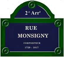Rue ouverte par une Ordonnance Royale du 8 octobre 1826. A cause du voisinage de l’ancienne salle de théâtre Ventadour, elle reçut le nom du compositeur Pierre-Alexandre Monsigny.