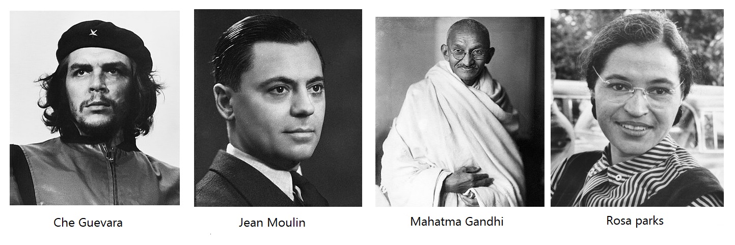 Parmi les quelques personnages qui ont marqué l’histoire des résistances, de la désobéissance et de l’insoumission dont on parlera : Olympe de Gouges – Jaurès – Jean Moulin – Lucie Aubrac – Mélinée et Missak Manouchian – Simón Bolívar – Gandhi – Che Guevara – Mandela – Rigoberta Menchu – Liu Xiaobo – Iqbal Masih – Tommie Smith et John Carlos – Rosa Parks – Sans oublier de citer les milliers d’anonymes insoumis pendant les guerres du Vietnam ou d’Algérie.